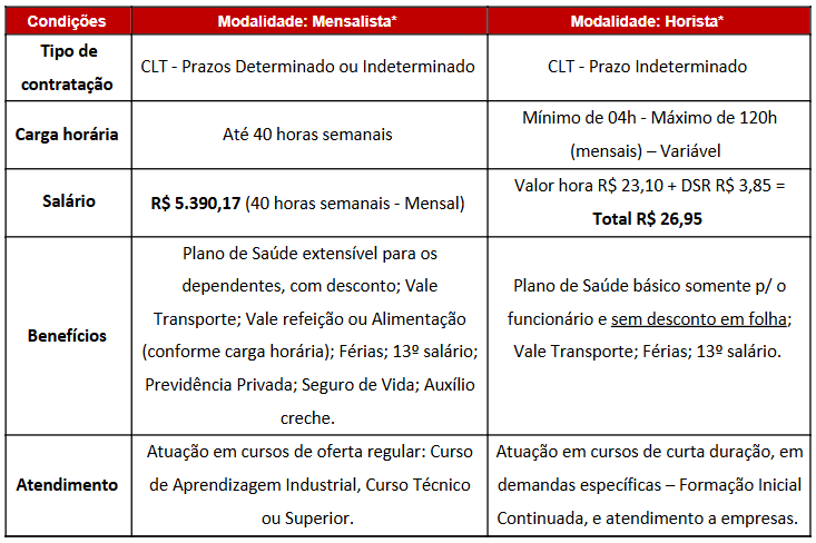 A modalidade de contratação e Carga horária será definida no momento da admissão, de acordo com a necessidade do SENAI.